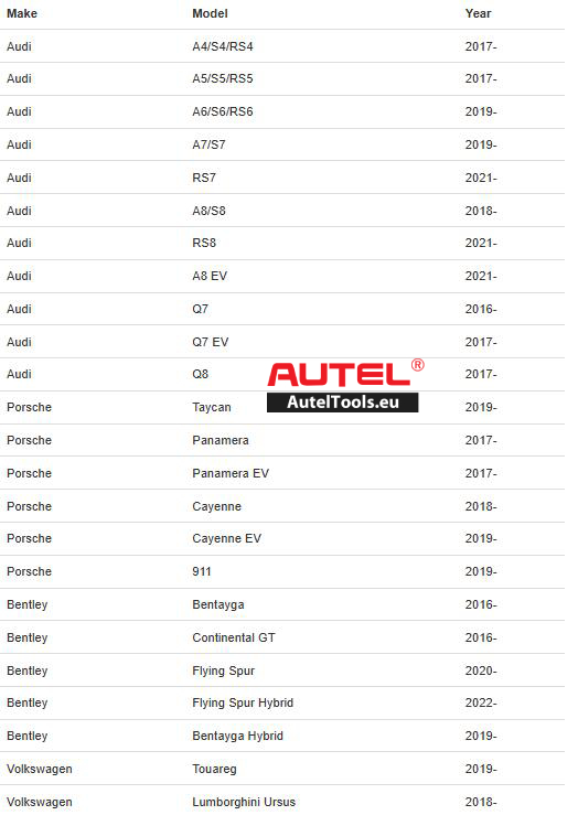 The Volkswagen Group MLB platform is a modular architecture used for sharing components across its longitudinally mounted front-engine vehicles, and was first applied to the Audi A5 model in 2007. The Autel APB300 can cover Audi A5, A7, and Porsche models such as the Cayenne and 911. Please refer to the table below for details: