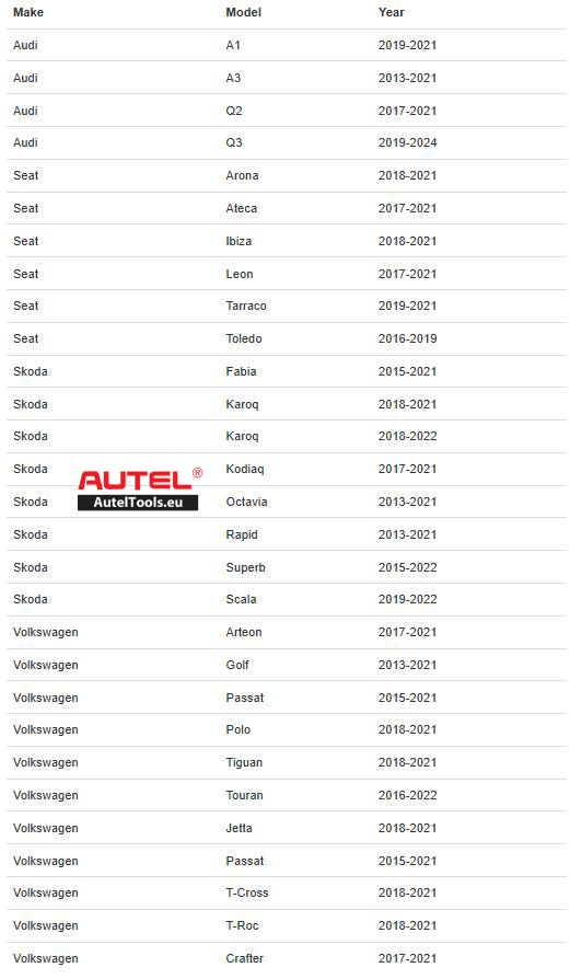 The MQB platform covers a wide range of vehicles, from small cars to large family sedans. The Autel APB300 is compatible with various models built on the MQB platform, including the VW Golf, Passat, Audi A3, A4, and many others. See the table below for a detailed list of compatible models: