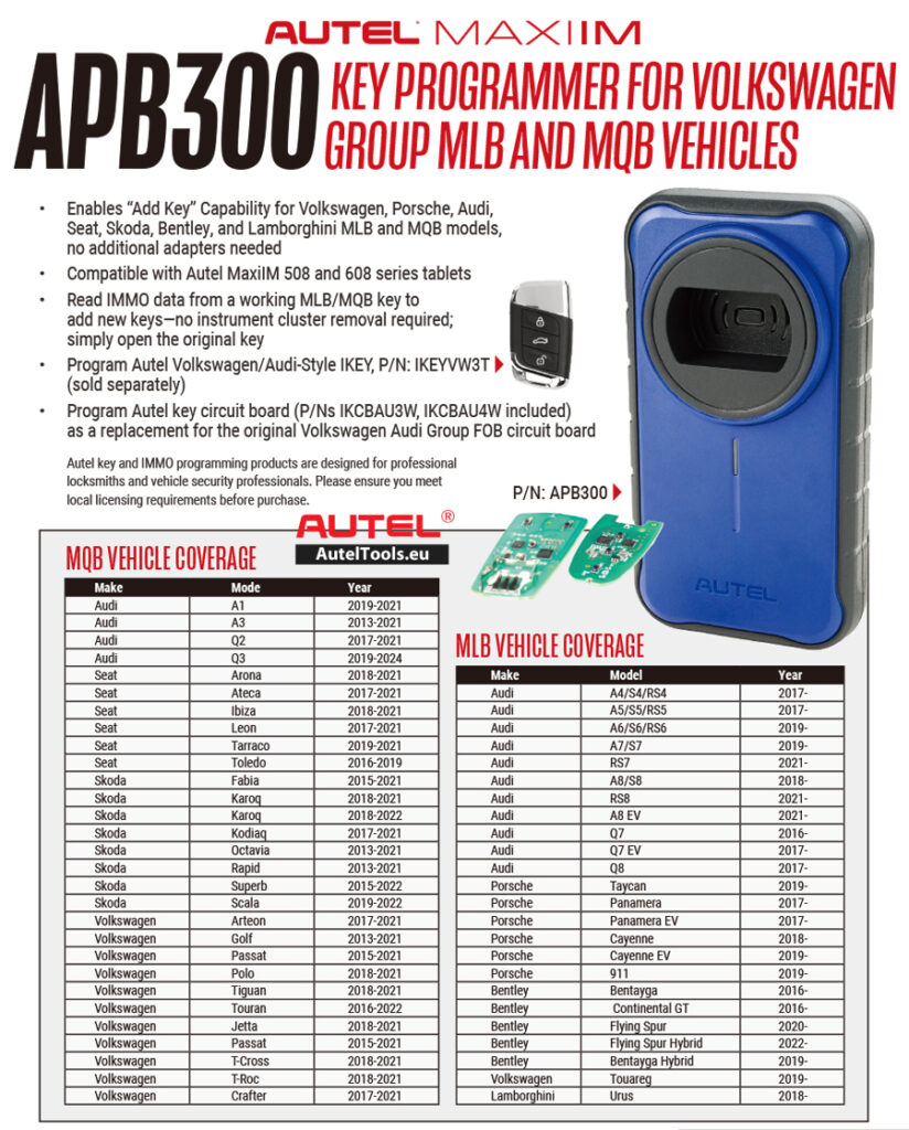 Enables” Add Key” Capatility for Volkswagen, Porsche, Audi,Seat,Skoda,Bentley and Lamborghini MLB and MQB models.