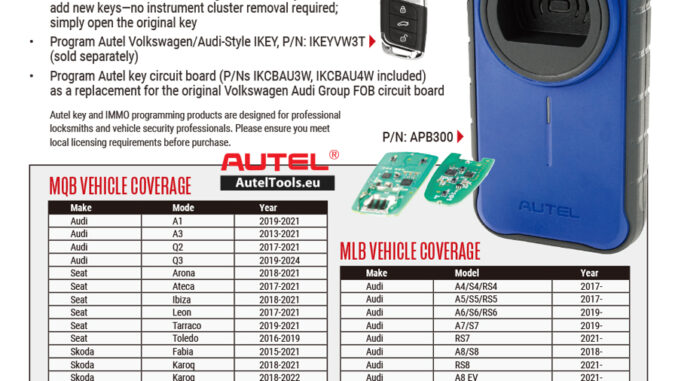 The MQB platform covers a wide range of vehicles, from small cars to large family sedans. The Autel APB300 is compatible with various models built on the MQB platform, including the VW Golf, Passat, Audi A3, A4, and many others. See the table below for a detailed list of compatible models: